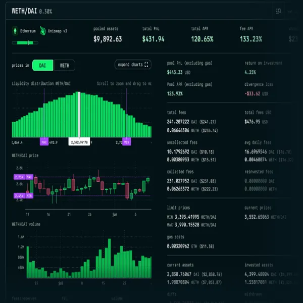 Dashboard da pool WETH/DAI exibindo rendimento de 120,65% APR, taxa de IL de -$33,62 e total de $9.892 em ativos.