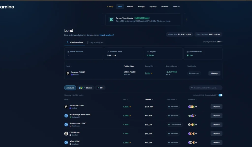 ![Alt Text: Screenshot of the Kamino Finance interface showing the ‘Lend’ panel. At the top, a banner highlights earnings on xStocks. Below, the account overview displays an active position of $692.35 with a 5.85% APY. The vault list includes Sentora PYUSD, RockawayX RWA USDC, and Steakhouse USDC with their respective yields and total deposits.]